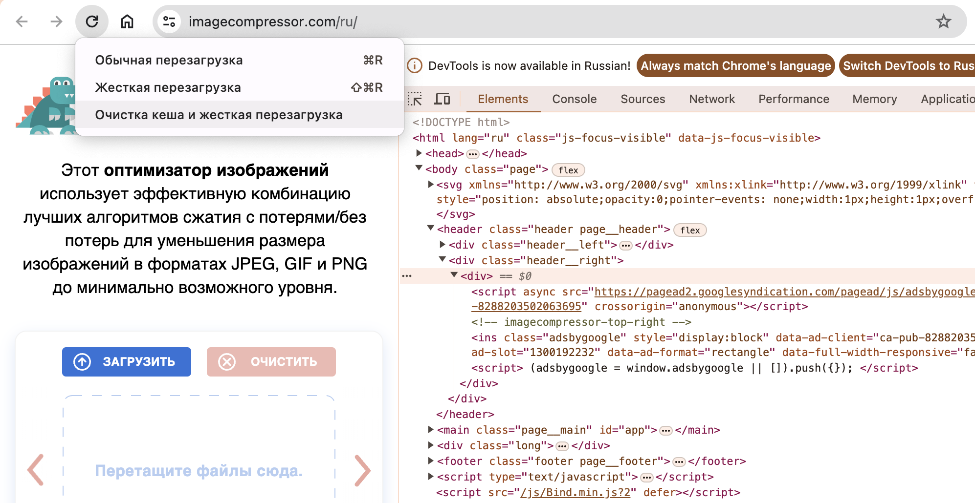 - Потом правой кнопкой нажмите на значок перезагрузки и выберите «Очистка кеша и жесткая перезагрузка».