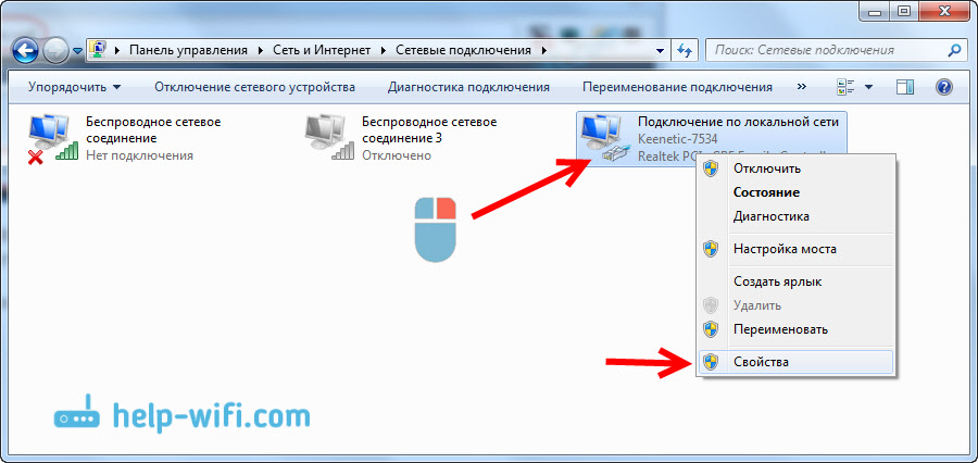 Нажимаем правой кнопкой мыши на адаптер, через который вы подключены к роутеру. Если по сетевому кабелю, то это «Подключение по локальной сети» (В Windows 10 – Ethernet). А если по Wi-Fi подключаетесь, то нажимаем на «Беспроводный адаптер», и выбираем «Свойства».