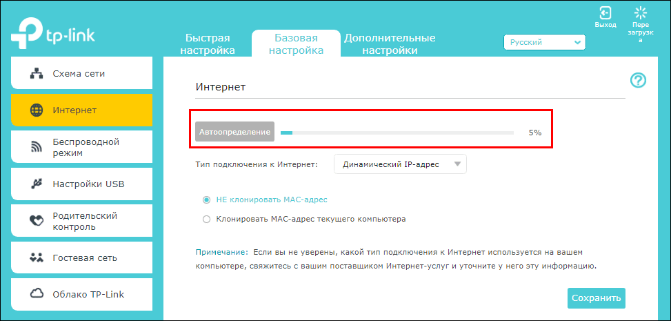 Практически все сетевое оборудование российского рынка автоматически распознает тип подключения к сети, используемый провайдером, и применяет его параметры в текущих настройках. Для этого достаточно вставить интернет-кабель в гнездо роутера, обозначенное «WAN или INTERNET», или вместе с этим нажать кнопку «Автоопределение», как на Archer A7.