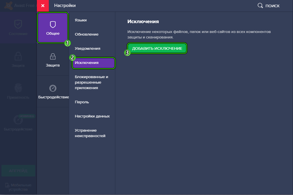 - Найти пункт «Исключения».