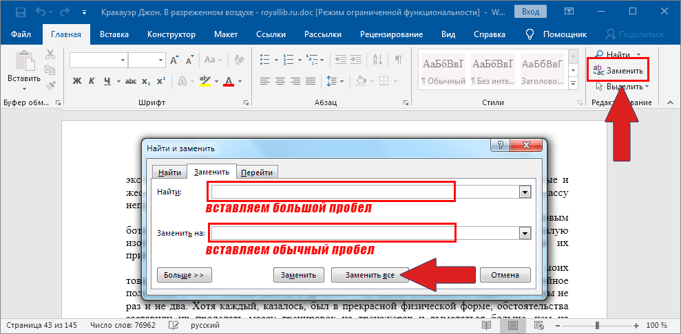 - Проверьте наличие лишних пробелов. Если слова слипаются и пробелы исчезают, возможно, в тексте есть лишние пробелы или пропущены пробелы между словами. Чтобы исправить это, выделите нужный текст, откройте меню «Правка» и выберите пункт «Найти и заменить». Введите пробел в поле «Найти» и пробел в поле «Заменить», затем нажмите кнопку «Заменить все».