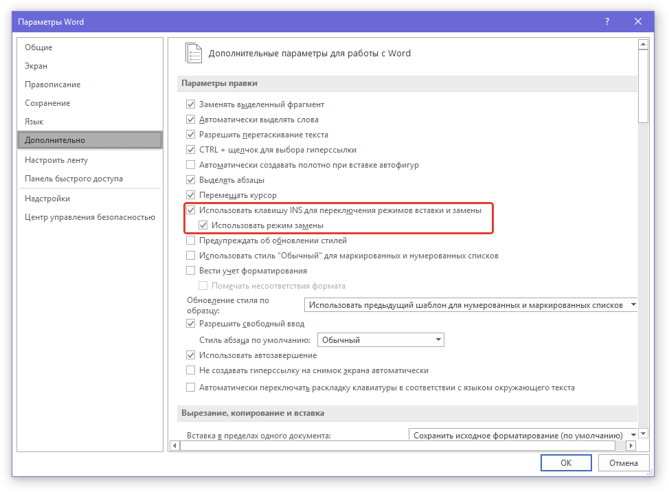 Отключение режима замены в ворде из-за которого буквы перед курсором во время набора текста стираются автоматически