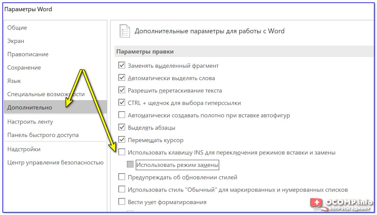 Делается это достаточно просто: сначала нужно открыть меню «Файл/параметры» , а после во вкладке «Дополнительно» снять галочку с пункта «Использовать клавишу INS для переключения режимов вставки и замена» (см. скриншот ниже ) .
