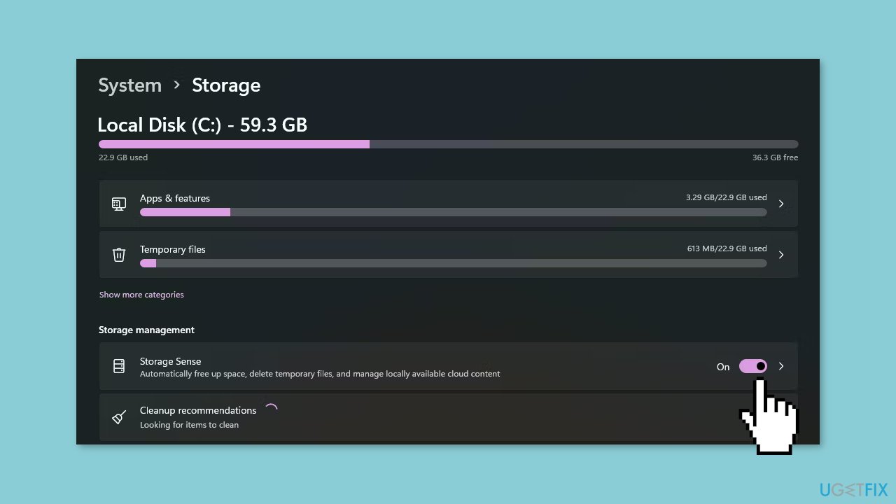 Перейдите в « Settings > System > Storage > Configure Storage Sense или запустите его сейчас. Если у вас недостаточно места для хранения, этот инструмент также исправит это.