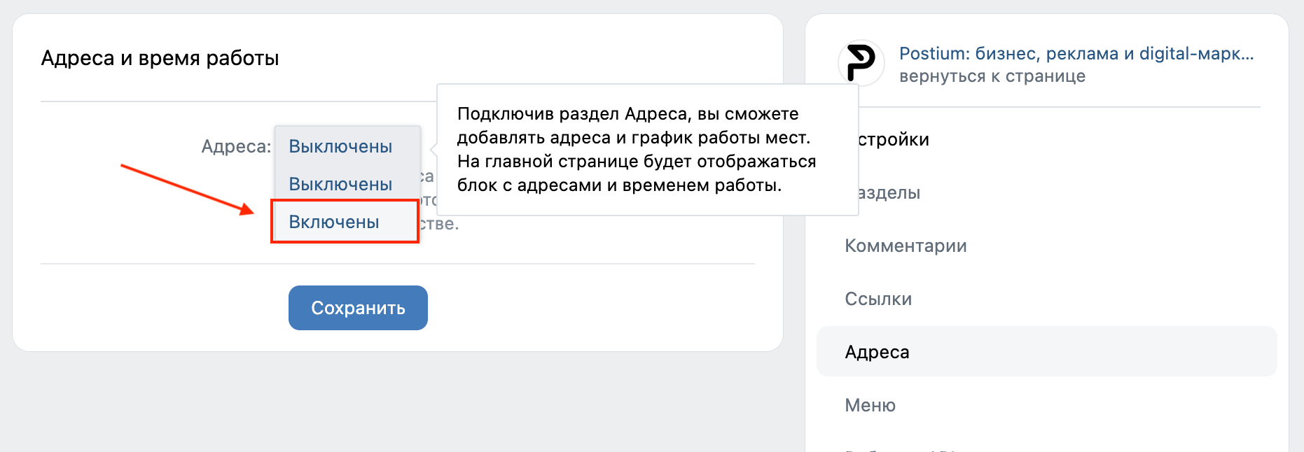 Полное название раздела звучит как Адреса и время работы, из которого понятно, что здесь можно указать фактический адрес компании (при наличии), добавить геолокацию, номер телефона и часы работы. Для групп, представляющих собой виртуальное представительство офлайнового бизнеса, эта опция крайне важна, поскольку создает впечатление открытости и доступности, как у действующих, так и потенциальных клиентов.