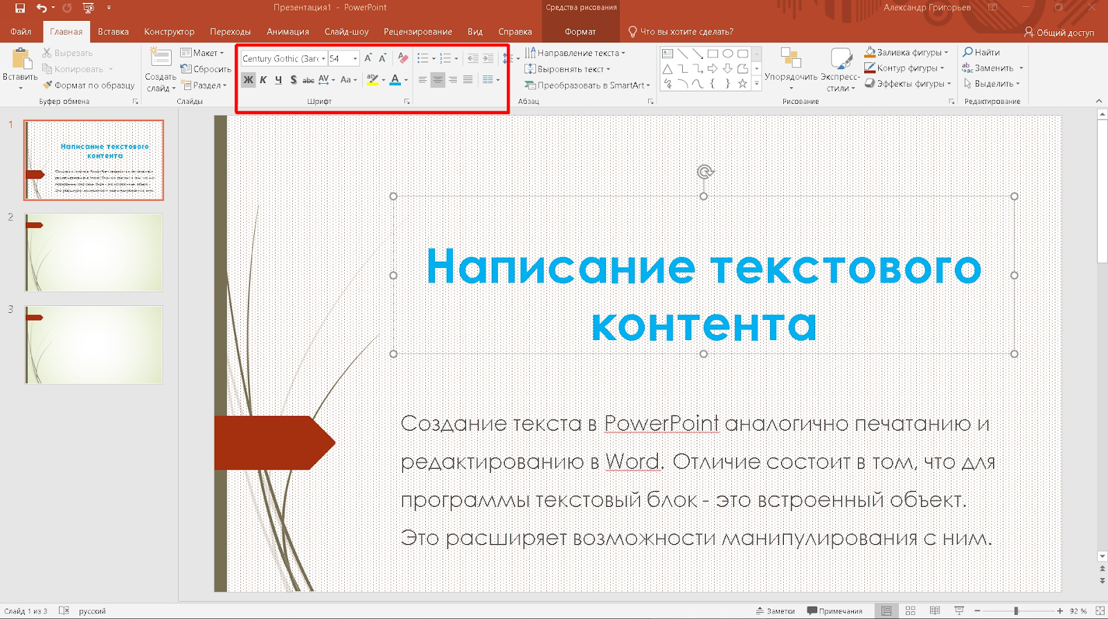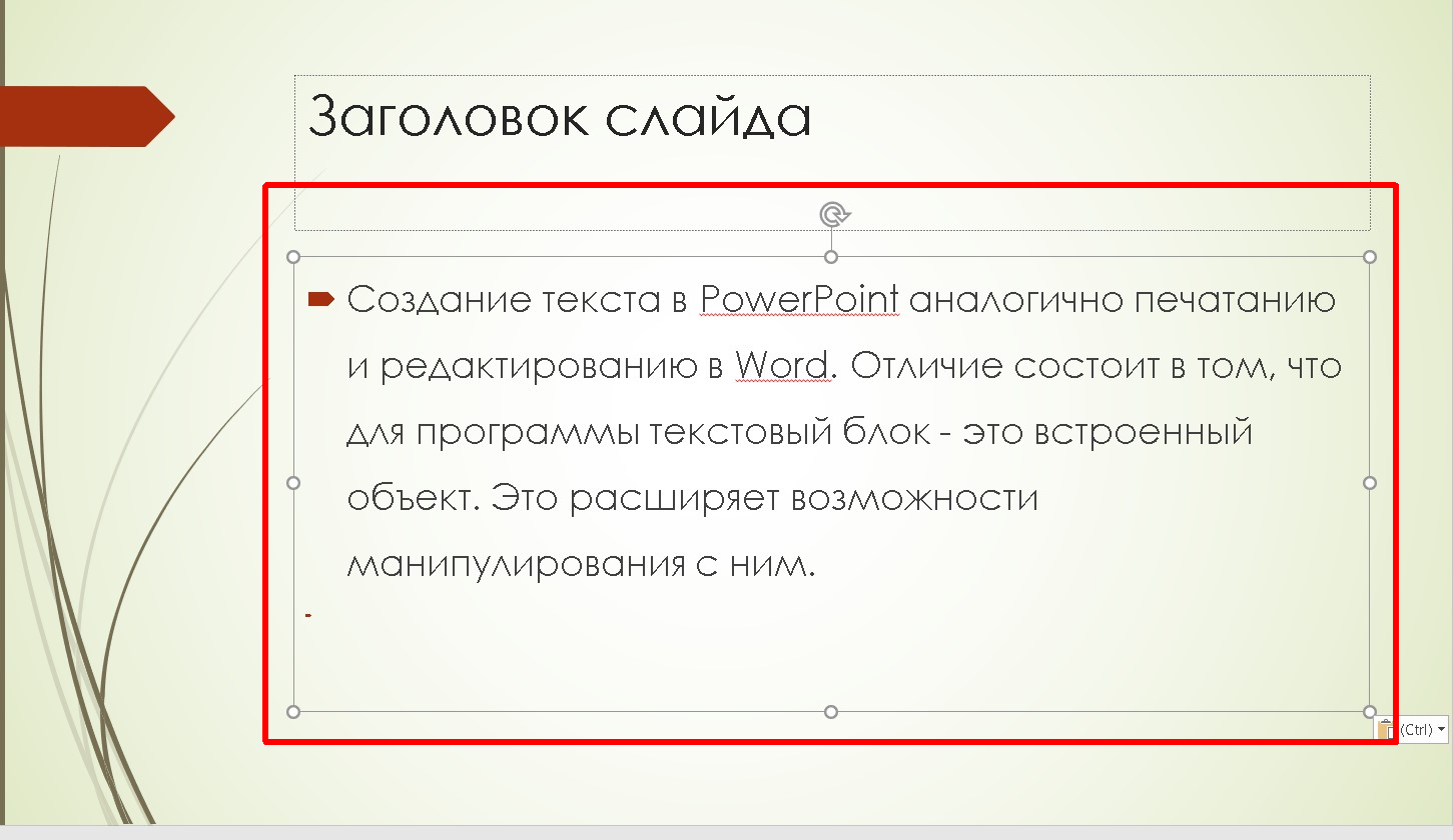 Создание текста в PowerPoint аналогично печатанию и редактированию в Word. Отличие состоит в том, что для программы презентаций текстовый блок — это встроенный объект. Это расширяет возможности манипулирования с ним.