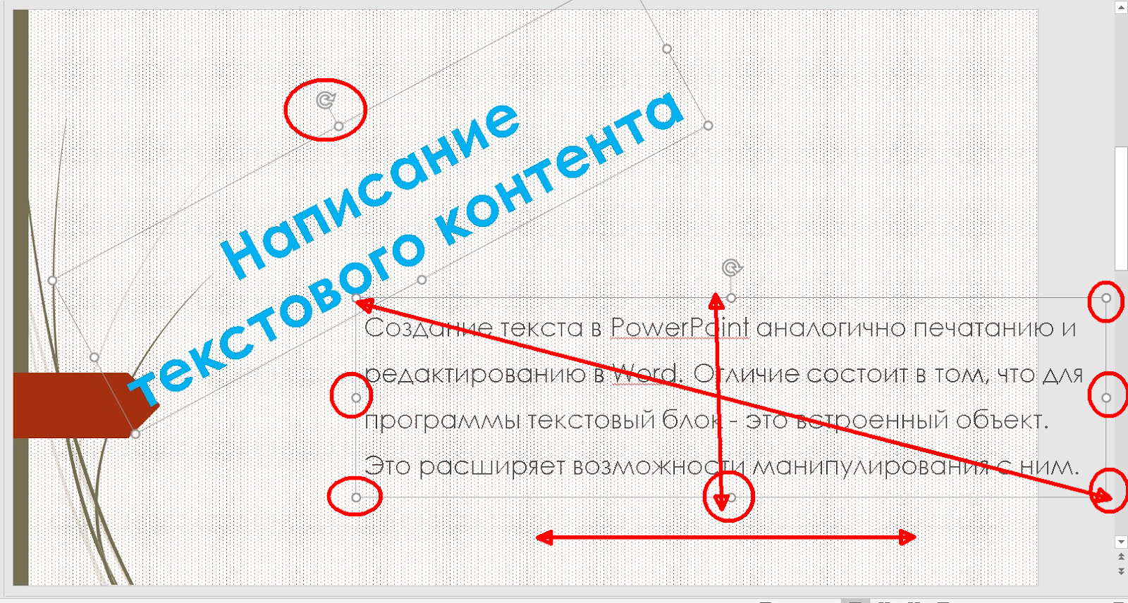 - Изменяйте размер текстового блока, его положение на странице, угол наклона, используя точки границы и верхнее выносное колесико границы блока для вращения.
