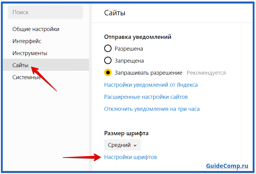 - Standart font (стандартный шрифт) – отвечает за подавляющее количество информации на страницах. Большая часть контента будет отображаться именно так. Ползунок под списком позволяет увеличить или уменьшить размер (по умолчанию установлено 16 пт).