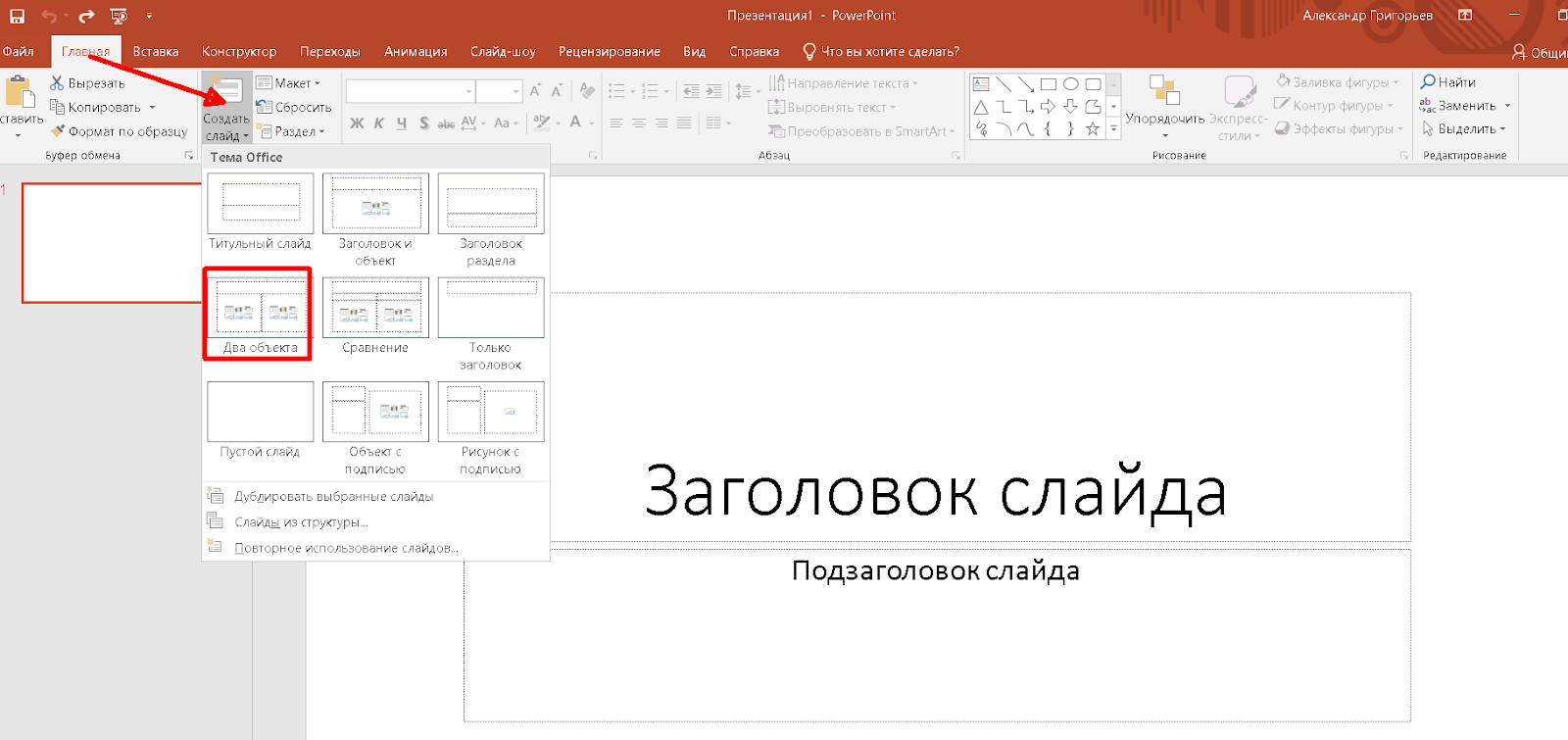 - В Ленте меню во вкладке “Главная” кликните по кнопке “Создать слайд”. Таким образом будет создан дубль существующего листа. Либо выберите в выпадающем меню страницу с желаемой структурой, например, “Два объекта”.