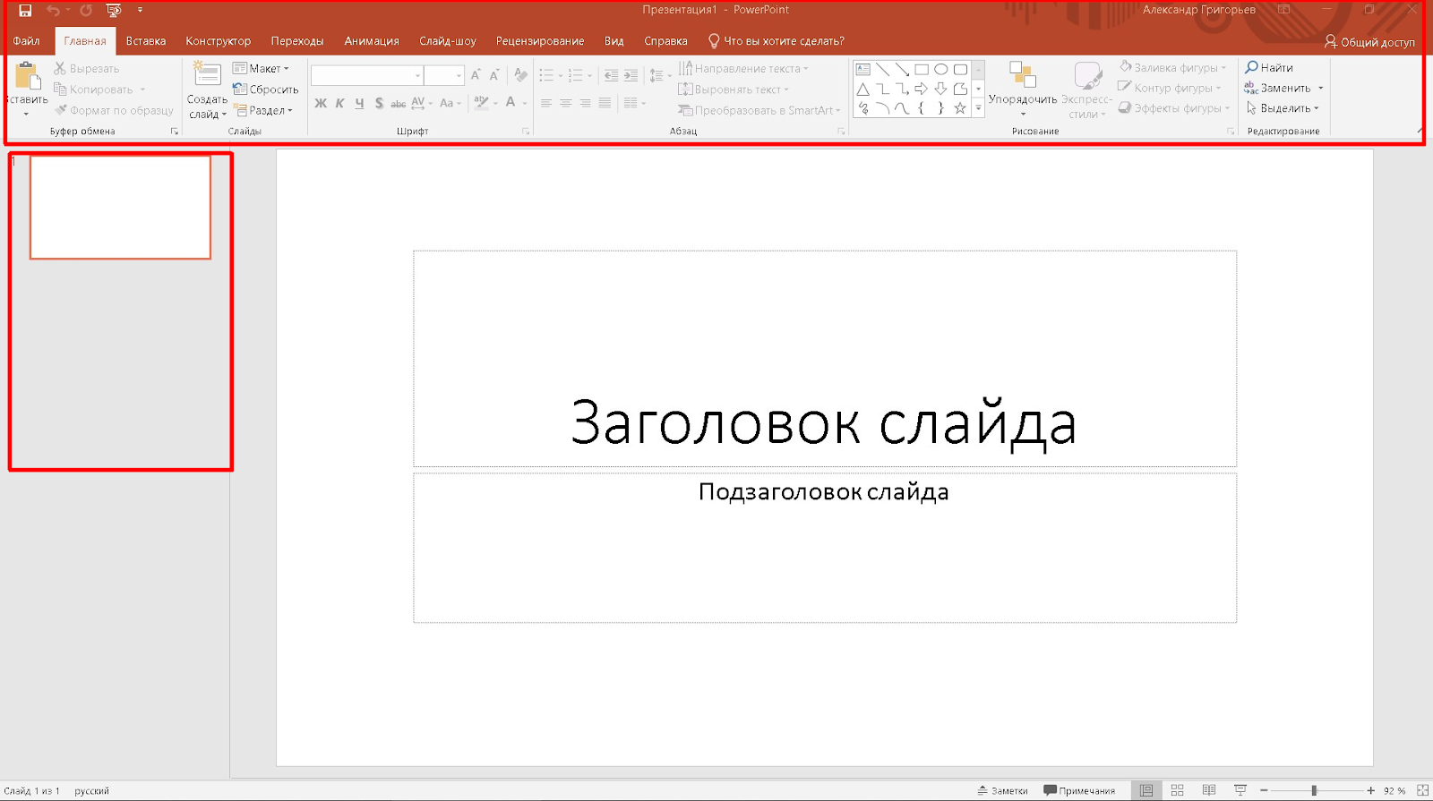 Вот так выглядит первая страница, иначе называемая “слайд”. Сразу предлагается создание заголовка и подзаголовка, как основных элементов всей структуры презентации