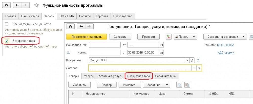 4. Если в настройке Функциональность на закладке Запасы установлен флаг Возвратная тара, то состав закладок документа выглядит так, как на рисунке 14г. То есть появляется закладка Возвратная тара.