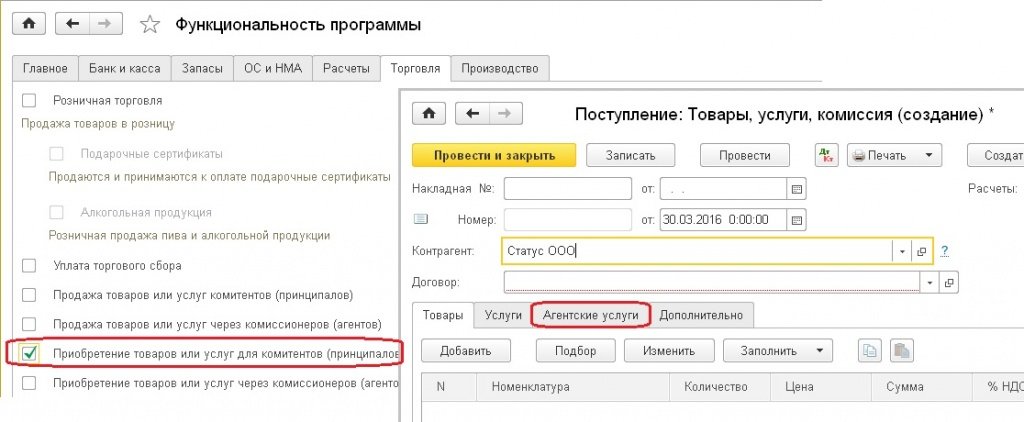 2. Если в настройке Функциональность на закладке Торговля установлен флаг Приобретение товаров и услуг для комитентов (принципалов), то состав закладок документа выглядит так, как на рисунке 14б. То есть появляется закладка Агентские услуги.