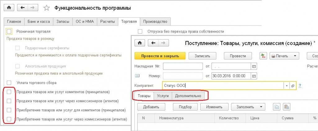 А вот при выборе такой операции, как Товары, услуги, комиссия (новое название операции Продажа, комиссия в «1С:Бухгалтерии 8» (ред. 2.0), количество видимых закладок будет зависеть от прежде выполненных настроек функциональности: