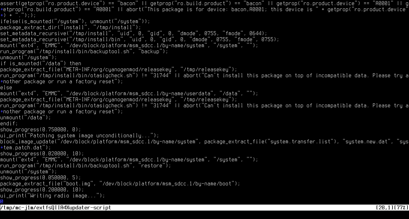Сами инструкции написаны на языке Edify, включающем в себя набор команд, которые могут понадобиться при установке: mount, unmount, package_extract_file, symlink, run_program и другие. Мы не будем обсуждать здесь все эти команды, они достаточно просты, и, чтобы ознакомиться с ними, достаточно распаковать любую прошивку и открыть updater-script в текстовом редакторе. Скажу лишь, что обычно такие файлы генерируются автоматически при сборке системы из исходников и только авторы узкоспециализированных прошивок (содержащих только ядро, например) пишут их самостоятельно.