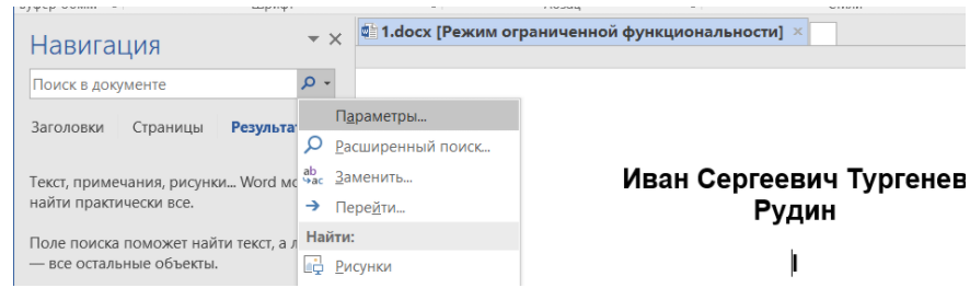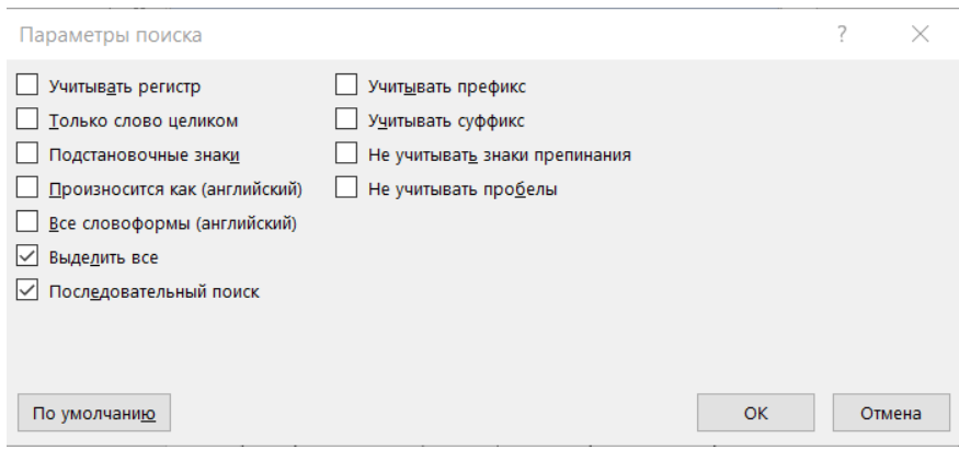 Если выбрать в выпавшем меню “Параметры”, откроется окно настройки поиска текстовой информации.