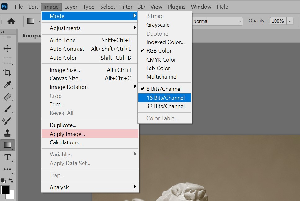 - Выберите меню Изображение, затем выберите опцию Режим, и, наконец, выберите опцию 16 бит/канал.
