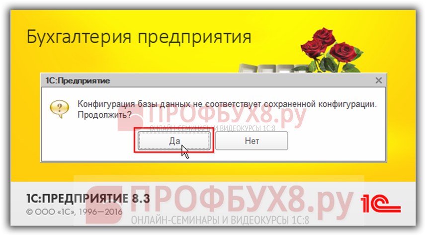 Теперь при запуске базы данных 1С 8.3 не будете видеть стартовое сообщение: «Конфигурация базы данных не соответствует сохраненной конфигурации» и программа 1С Предприятие будет запускаться в привычном порядке.