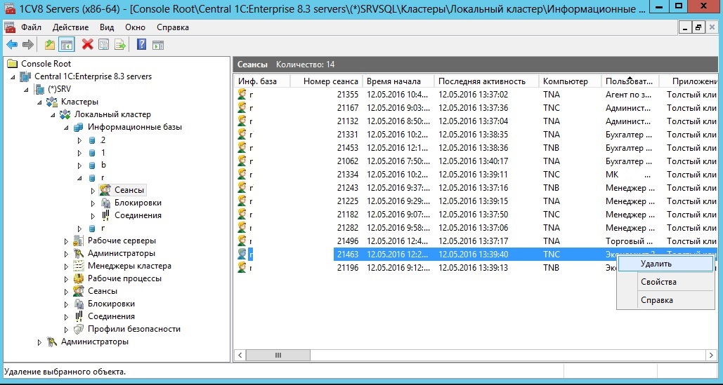 Для серверной базы данных возможностей чуть больше. Доступен первый способ, а также можно удалять активных пользователей с консоли сервера 1С. Для этого необходимо в ветке найти информационную базу, ветку «Сеансы» и удалить активные сеансы пользователей. Данный способ не совсем гуманный с точки зрения внезапного прекращения работы пользователя без предупреждения, но зато очень эффекивный и быстрый. Минус в том что после удаления сеансов пользователи могут снова пытаться входить в программу. Поэтому рекомендуется незамедлительно после удаления активных сеансов из консоли приступить к выполнению намеченных заданий.