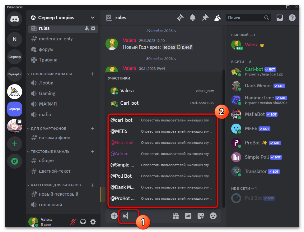 Существует не так много обстоятельств, когда требуется упомянуть роль именно по ее идентификатору, а не через название. В большинстве случаев это относится к работе с вебхуками, о чем уже было сказано выше. Поэтому чаще пользователям будет удобнее просто использовать стандартный тег @, а затем из списка выбрать любую роль по ее названию.