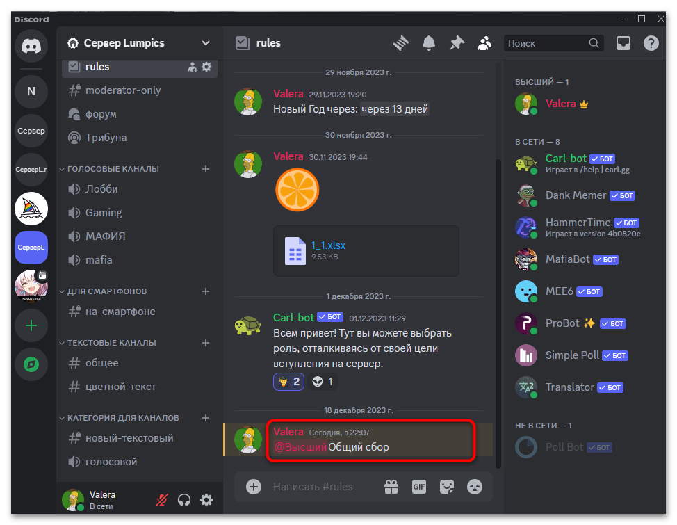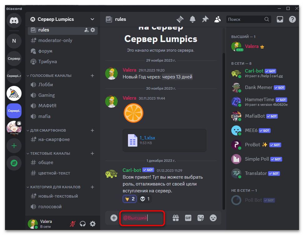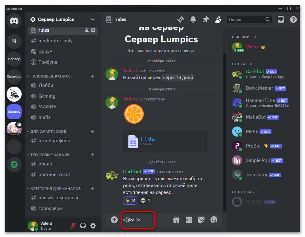 Можете вернуться в любой чат и начать набирать сообщение с пингом роли через ее ID. Для этого используйте команду , где ID замените на скопированный ранее идентификатор.