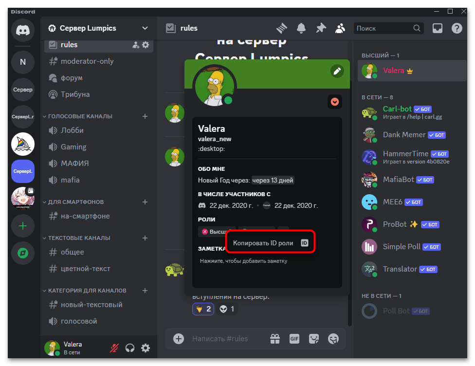 - После включения режима разработчика, о чем уже было сказано выше, можете скопировать ID роли любым удобным методом. Проще всего будет открыть карточку одного из пользователей и нажать правой кнопкой мыши по нужной роли.