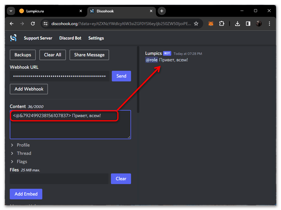 Обязательно проверяйте перед отправкой сообщений правильность введенных ID и корректность отображения сообщений, особенно если используете какой-то сторонний инструмент, отличающийся от того, который был рассмотрен в упомянутой выше статье. В остальном же принцип упоминаний остается одинаковым для всех средств работы с вебхуками. В большинстве из них точно так же можно упоминать и несколько ролей сразу, используя ту же формулу с программным кодом.