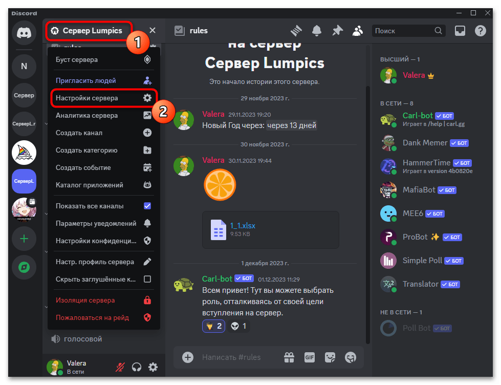 Если искать роль таким способом не очень удобно, разверните меню сервера и перейдите в его настройки, выбрав пункт с соответствующим названием.