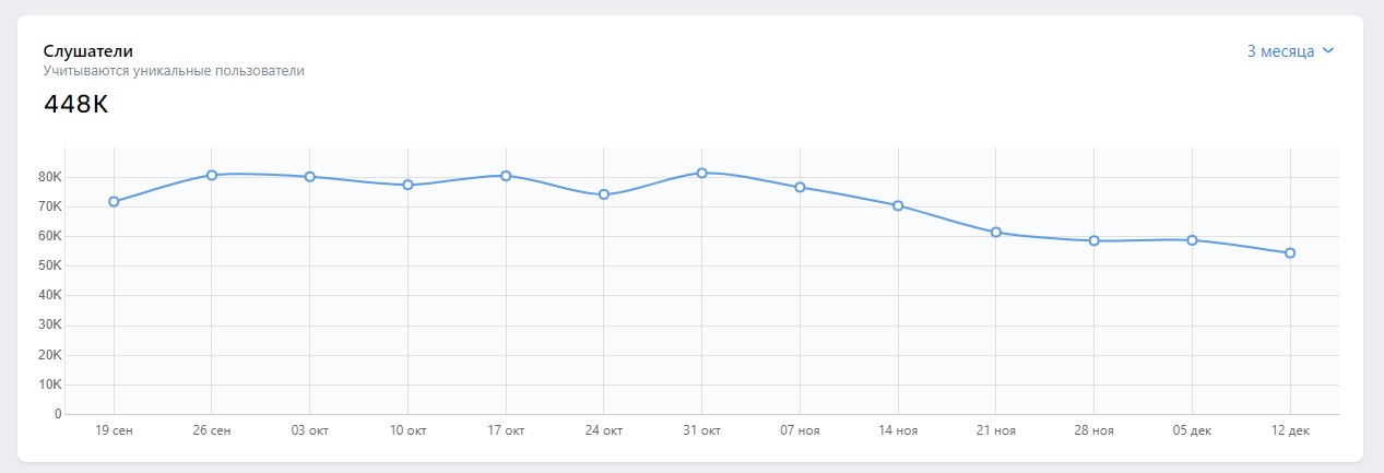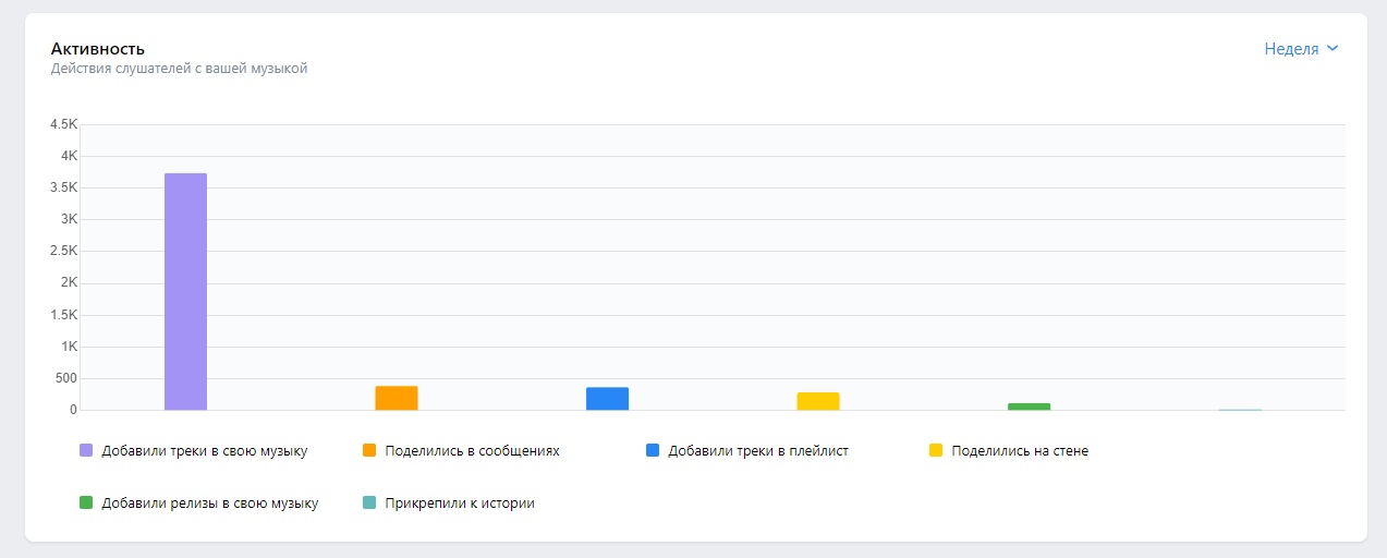 Здесь можно найти количество уникальных пользователей, слушающих вашу музыку, а также проверить, как много из них подписались на ваше сообщество. График поможет оценить рост числа ваших поклонников за всё время или определённый период