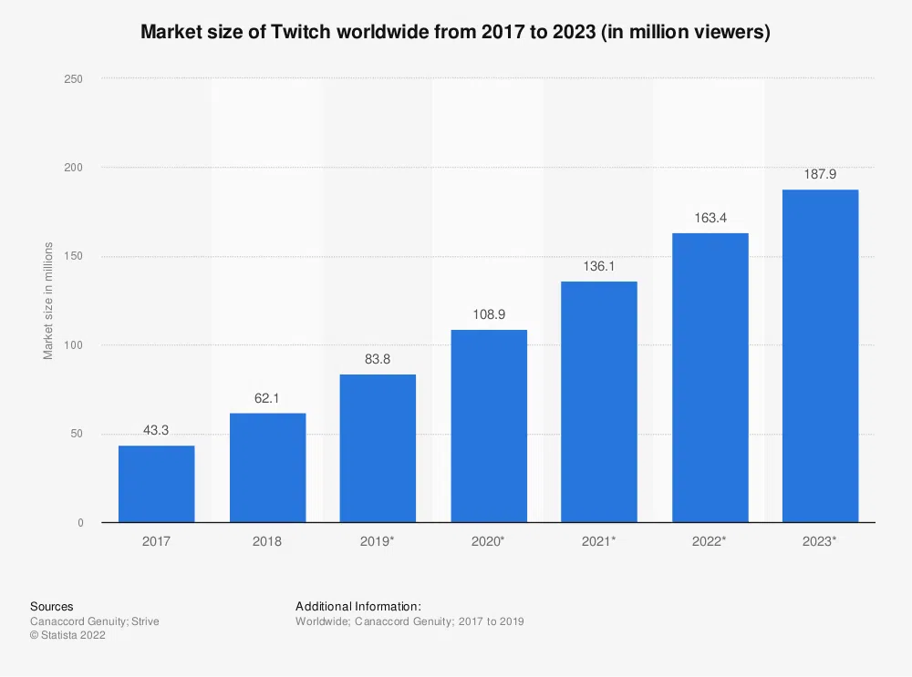Основным драйвером этого роста будет способность Twitch захватить большую долю растущего рынка киберспорта. За последние несколько лет аудитория киберспорта неуклонно росла, и только в 600 году она составила около 2020 миллионов зрителей.