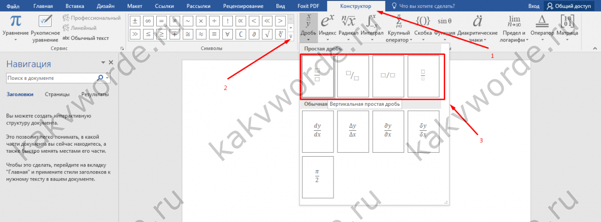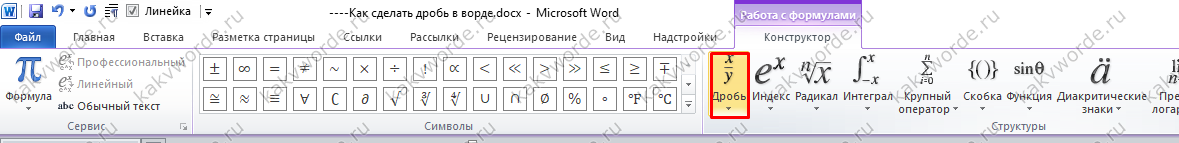 - В меню «Конструктор» нажать на «Дробь». Далее выбрать соответствующий вариант: либо дробь через слеш, либо с помощью горизонтальной линии.