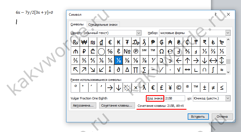 На картинке ниже видно, что вставить обыкновенную дробь можно и с помощью сочетания клавиш, зная код знака. В нашем случае пишем код знака 215B и удерживая Alt нажимаем на X (английская).