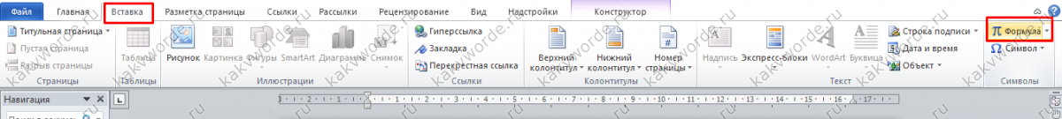 - Вкладка «Вставка» раздел «Символы» и кнопка «Уравнение»;