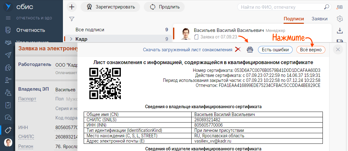 - другой носитель — вставьте его в компьютер. Откройте заявку в том разделе, где создавали ее. В листе ознакомления нажмите «Все верно».