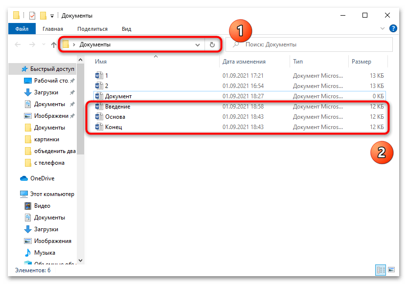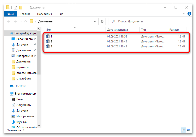 Измените название файлов так, чтобы они шли последовательно друг за другом и сортировались в том порядке, в котором их нужно объединить. Например, назовем их номерами от 1 до 3 для наглядности, а старые документы удалим.