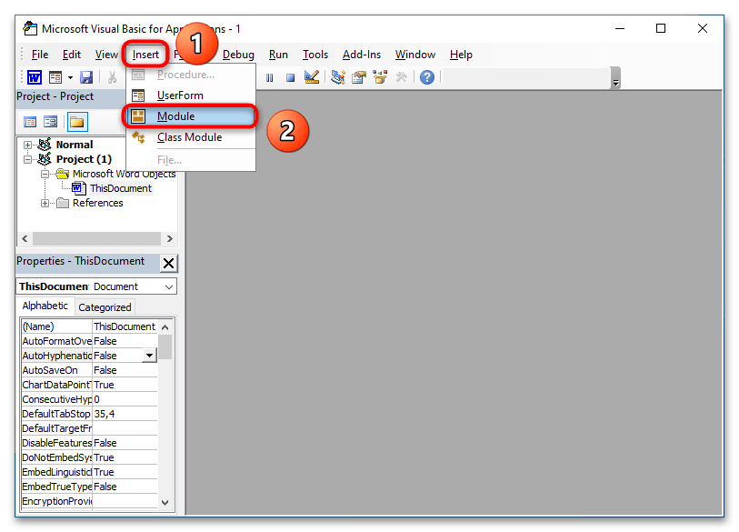 После открытия нажмите сочетание клавиш «Alt + F11» и дождитесь запуска программной среды VBA. Выберите в верхнем меню пункт «Insert» и подпункт «Module», чтобы создать исполняемый модуль для работы с документами.