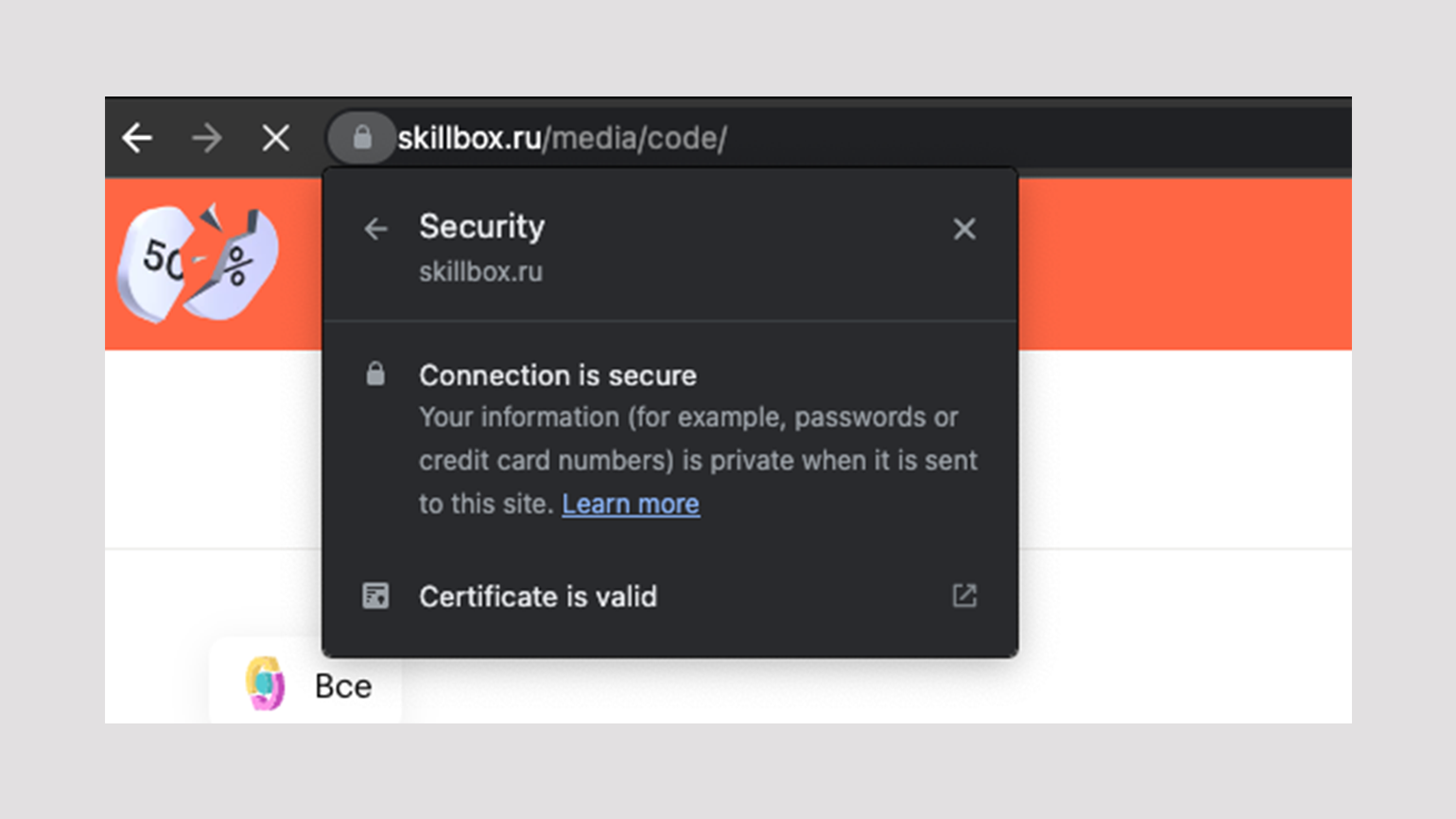 Убедиться, что SSL-протокол работает, можно почти во всех браузерах. Например, в Google Chrome рядом с адресом сайта есть замок, который говорит о том, что передача данных защищена: