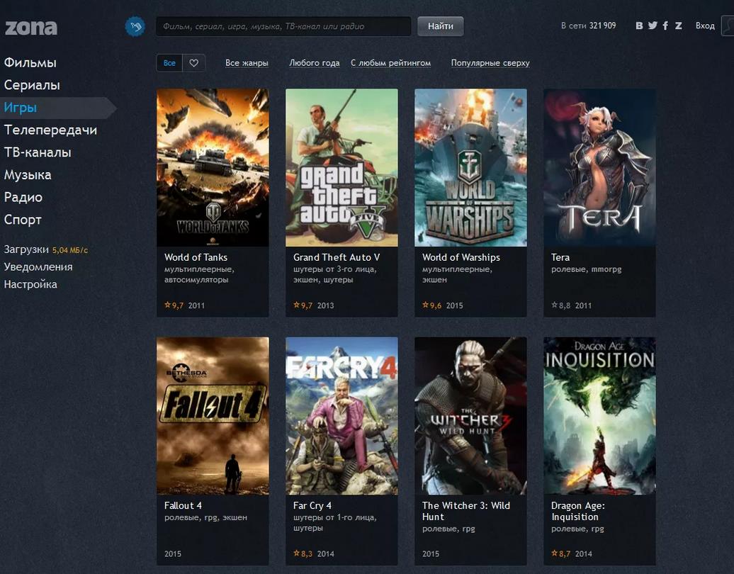 Главное преимущество Zona — это огромная база торрентов с сотнями тысяч файлов. Все они проиндексированы и удобно структурированы по категориям и жанрам. Еще один плюс — интуитивно понятный интерфейс с минимумом настроек.