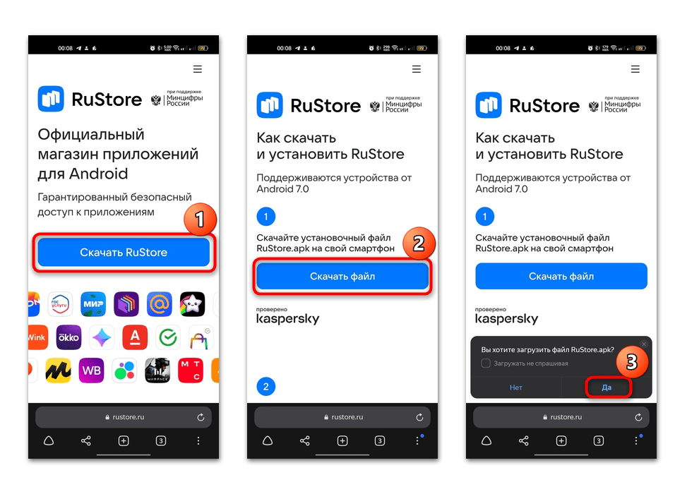 - Попав на главную страницу официального сайта, нажмите на кнопку для скачивания маркета и подтвердите действие во всплывающем окне. Поскольку таким образом вы скачали APK-файл, то его потребуется установить – найдите его в «Загрузках» через файловый менеджер или одноименный раздел браузера и запустите.