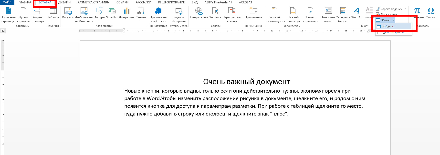 Первым делом открываю «Основной» файл, и ниже «статичного» текста который у меня меняться не будет, ставлю курсор на новую строку. Перехожу на панель «Вставка», и в группе «Текст» нахожу кнопку «Объект». Здесь в выпадающем меню выбираю «Объект«.