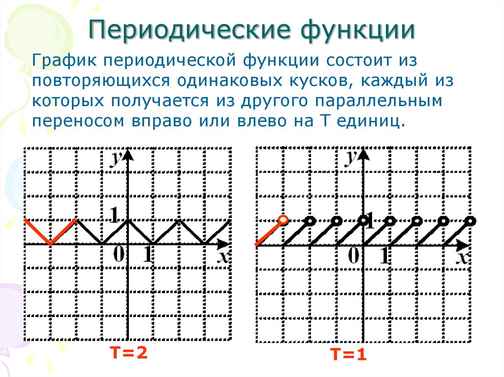График периодической функции состоит из неограниченно повторяющихся одинаковых фрагментов.