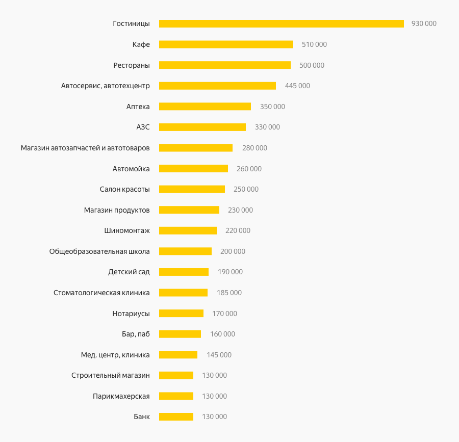 Популярность категорий бизнеса, который ищут на Яндекс.Картах (данные 2018 года)