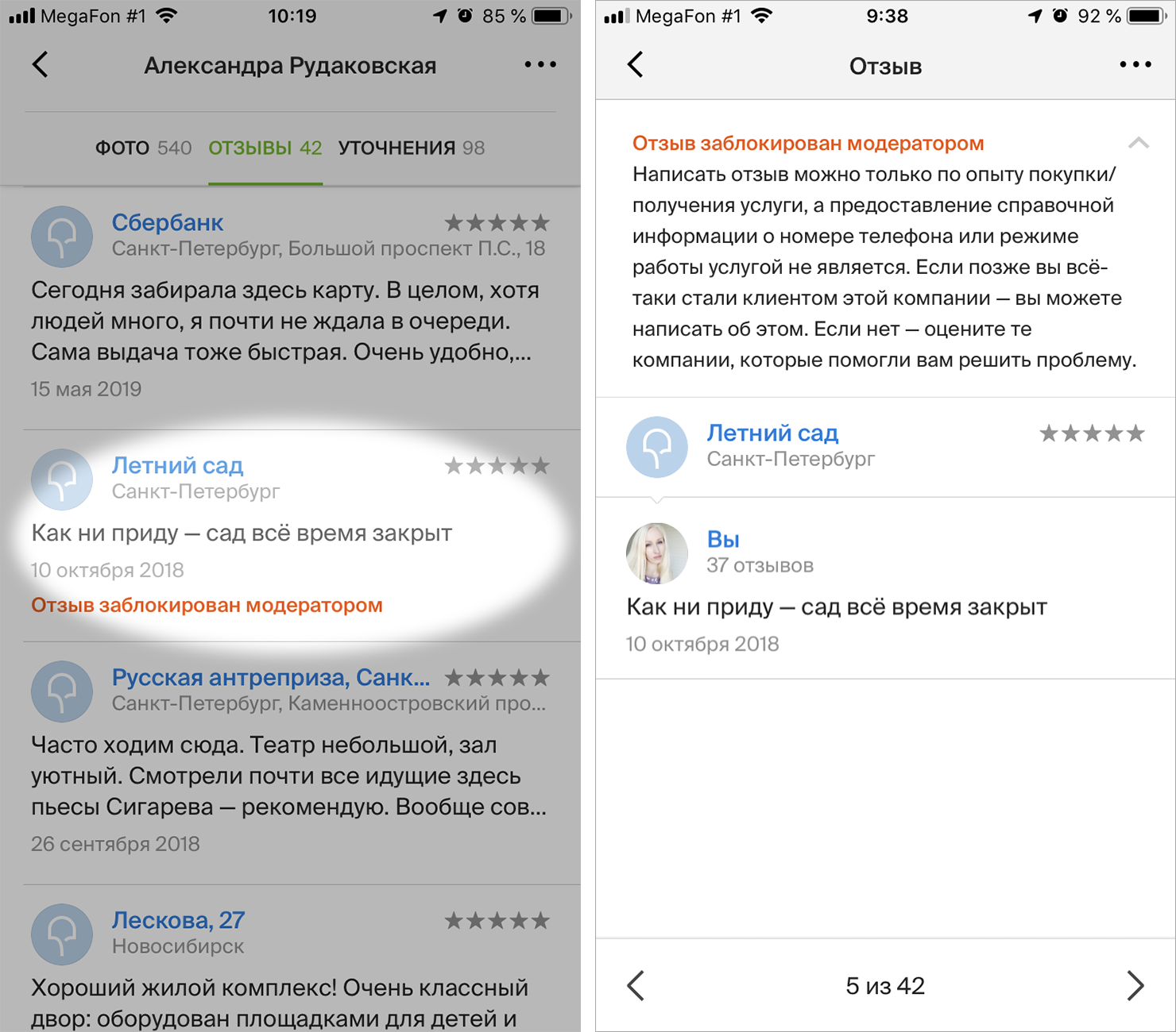 Мы не удаляем отзывы за деньги или по просьбе компаний. Если вы не можете найти свой отзыв в 2ГИС — он либо удалён за нарушение правил, либо попал в раздел « Неподтверждённые отзывы ».