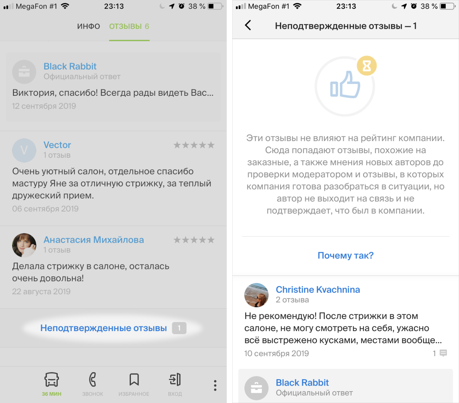 В разделе « Неподтверждённые отзывы » размещены отзывы, в достоверности которых нет полной уверенности. Чтобы попасть в раздел, нужно открыть карточку компании, перейти во вкладку «Отзывы» и промотать ленту отзывов немного вниз.
