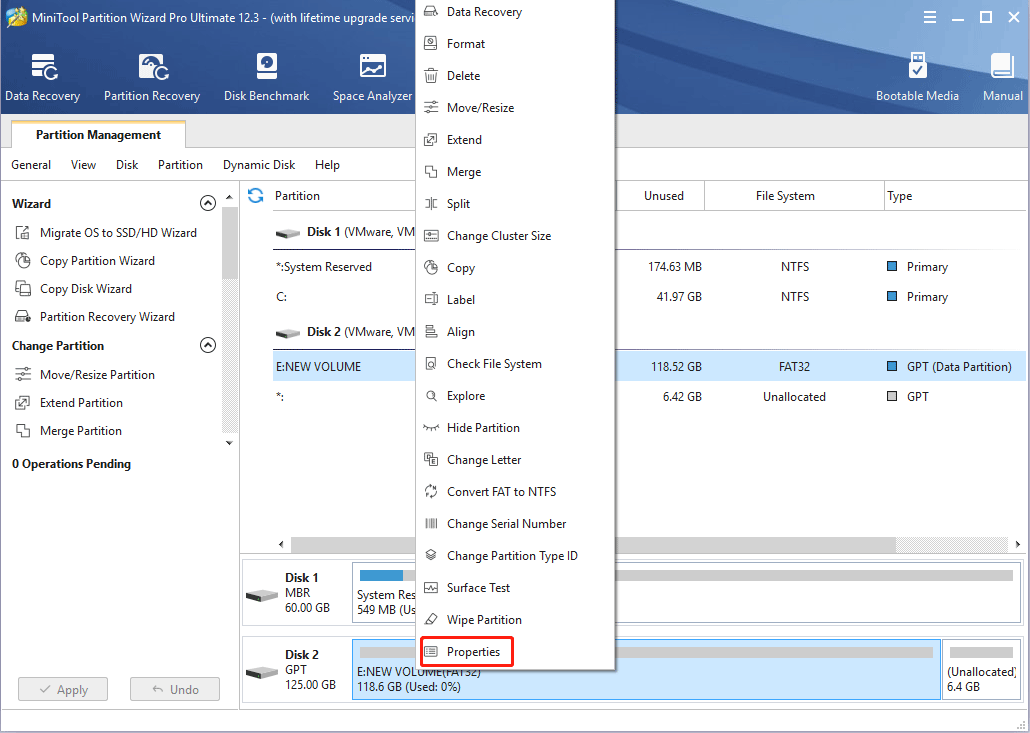 Step 1: Launch MiniTool Partition Wizard and go to its main interface. Right-click the FAT32 partition and choose Properties.