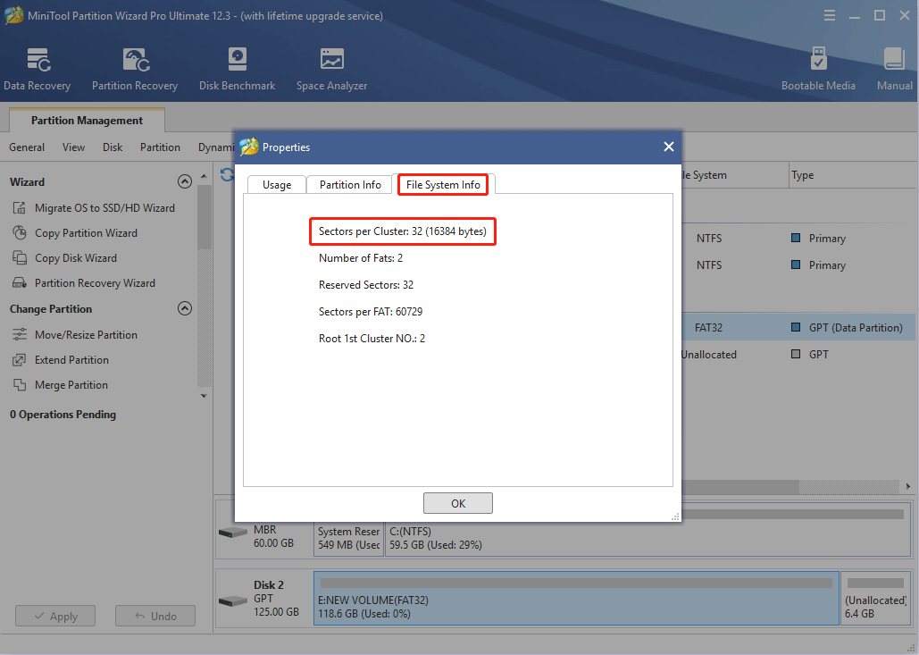 Step 2: Skip to File System Info tab. The Sectors per Cluster will tell you the cluster size of the partition (in the picture, the cluster size is 16384 bytes / 1024= 16 KB). Then, you can decide whether to change the cluster size.
