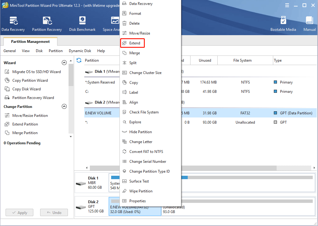 Step 1: Launch this software and go to its main interface again. Right-click the FAT32 partition and choose Extend from the menu.