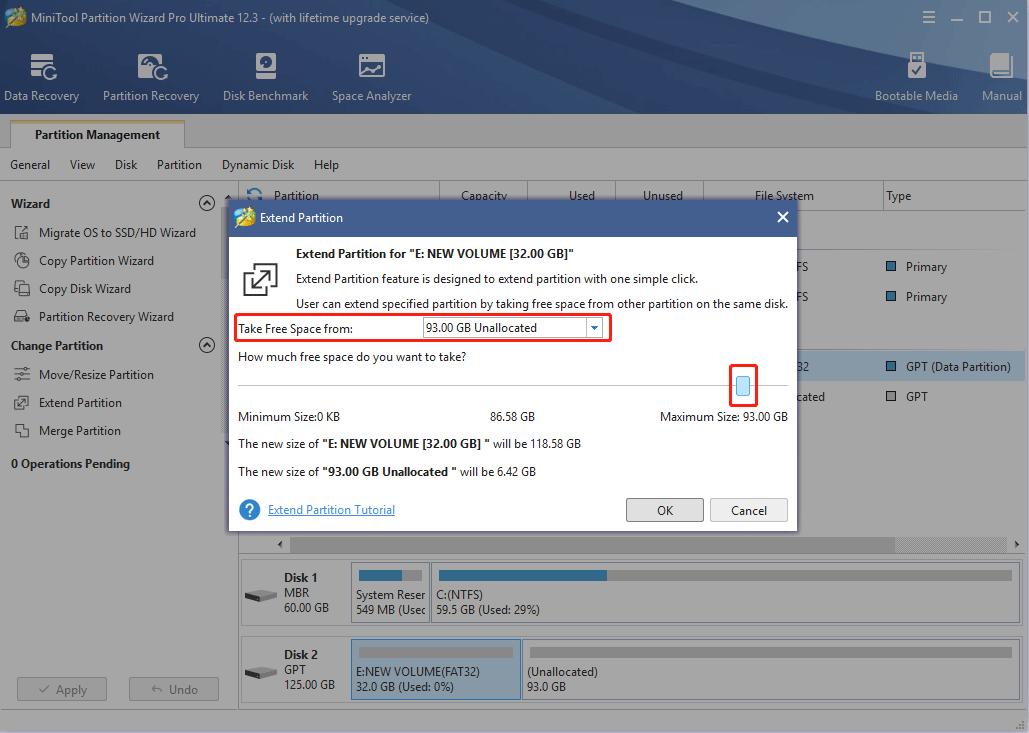 Step 2: In the Extend Partition window, choose where to take free space (another partition or unallocated space). Drag the blue block to determine how much space you want to take. Then click the OK button.