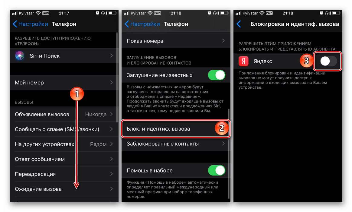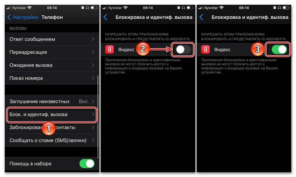 Затем откройте подраздел «Блокировка и идентификация вызова» и активируйте переключатель программы «Яндекс». Так вы разрешите приложению блокировать и представлять ID абонента.