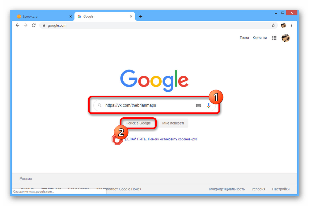 - Поисковая система Google не сильно отличается от Яндекса в плане своей основной функции. Для начала перейдите на главную страницу сервиса и в текстовое поле вставьте URL-адрес нужной анкеты на сайте ВКонтакте.