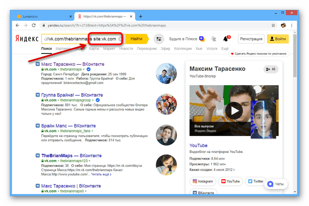 Если поиск завершится успешно, в первых же строчках вы увидите ссылку на нужный профиль ВК. При этом в случае необходимости можно улучшить поиск, добавив в конец поискового запроса следующий код.
